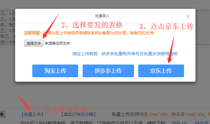 5、打开网站选择要购买的快递,到下单页面,点击《批量上传》找到刚刚下载的《订单明细》点击《打开》。